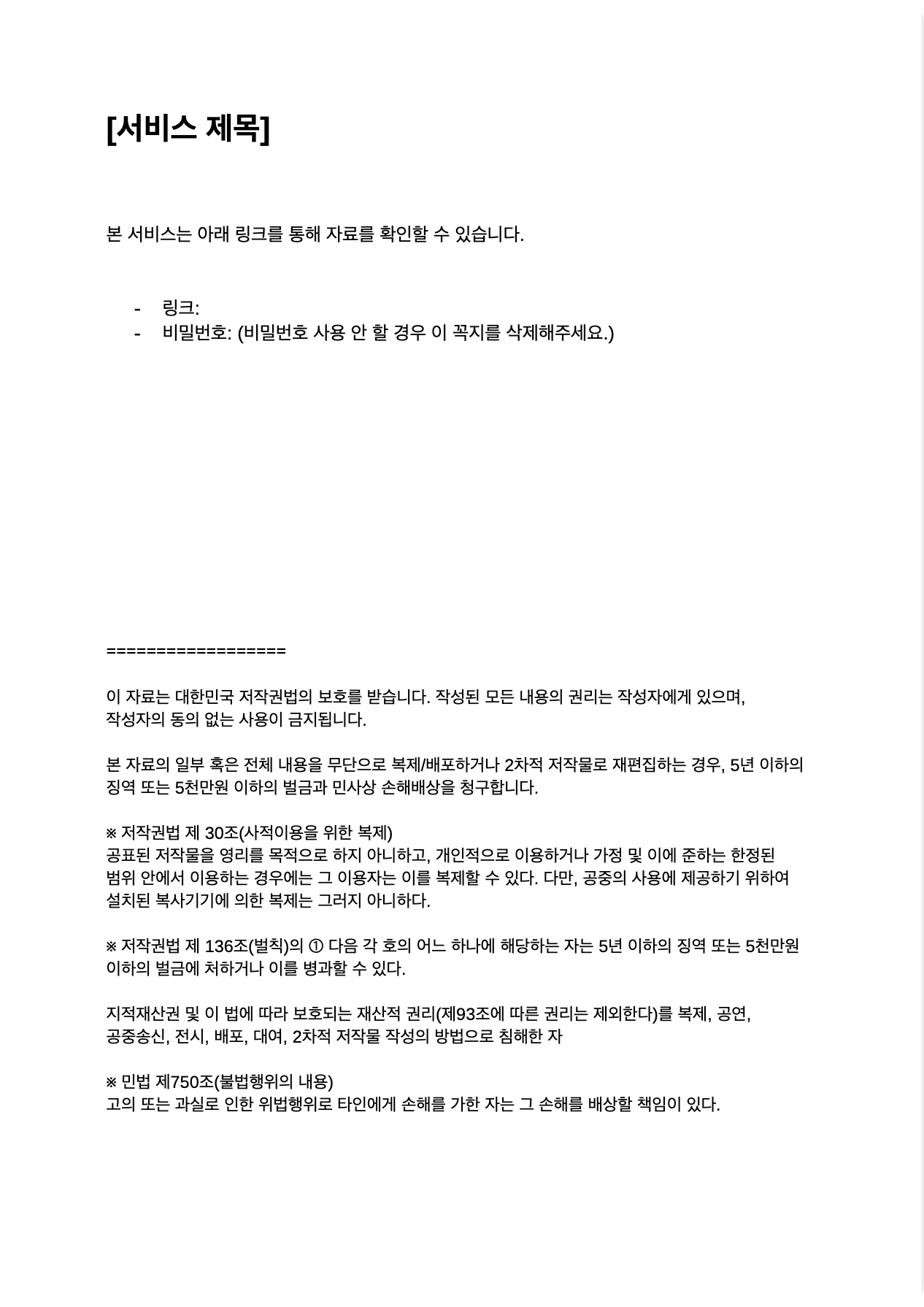 이 자료는 대한민국 저작권법의 보호를 받습니다. 작성된 모든 내용의 권리는 작성자에게 있으며, 작성 자의 동의 없는 사용이 금지됩니다. 본 자료의 일부 혹은 전체 내용을 무단으로 복제/배포하거나 2차적 저작물로 재편집하는 경우, 5년 이하의 징역 또는 5천만 원 이하의 벌금과 민사상 손해배상을 청구합니다.