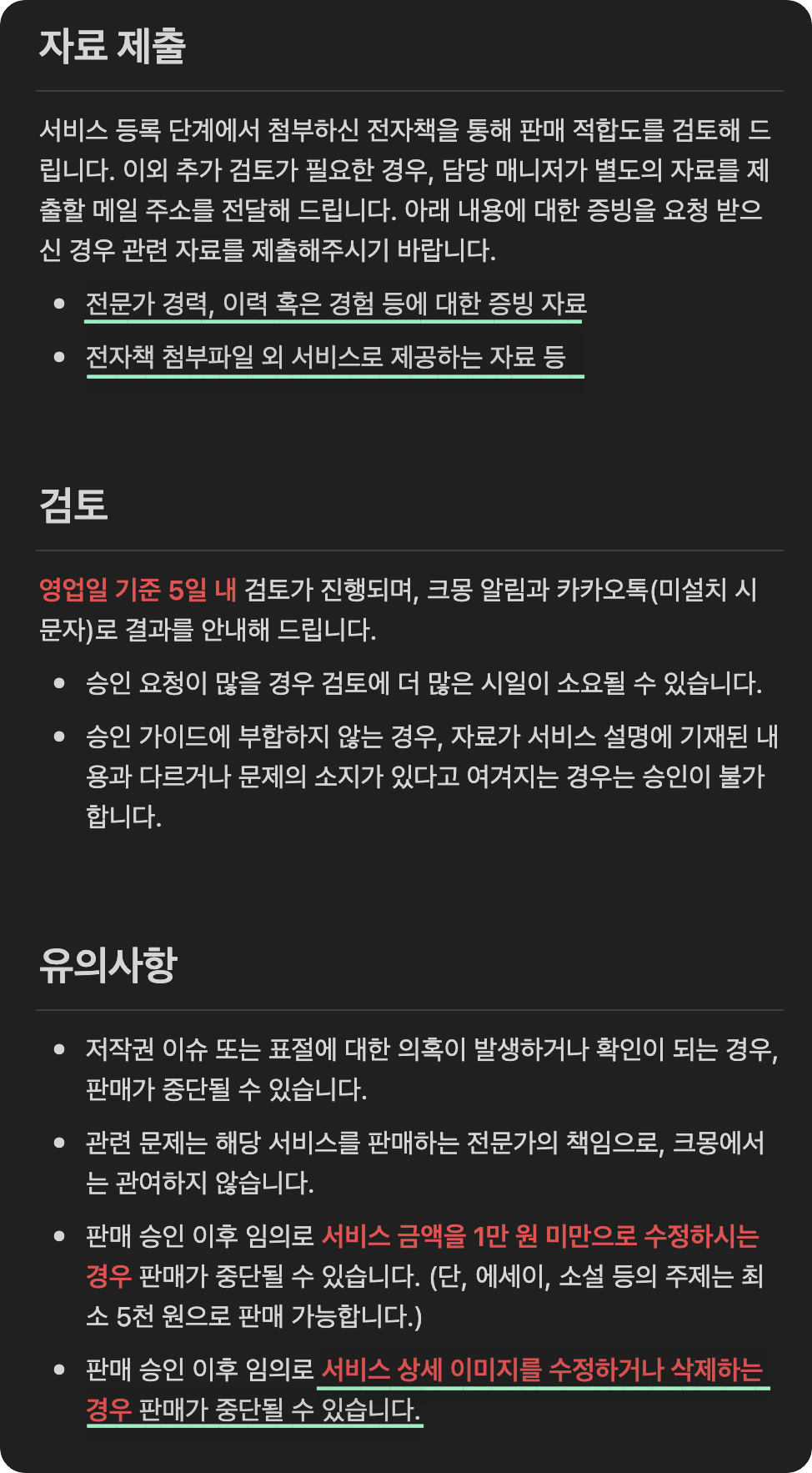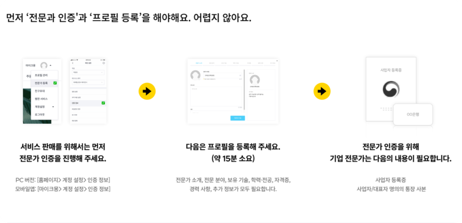 이제부터는 크몽에서 검수할 차례인데요. 혹시 '매출 얼마', '경력 몇 년' 등등 증빙이 필요한 부분이 있다면 매니저가 자료 제출을 요구할 수 있으니 참고해 주세요. 여러모로 귀찮을 수는 있지만, 이 부분을 보니 소비자 관점에서는 마음이 놓이네요.