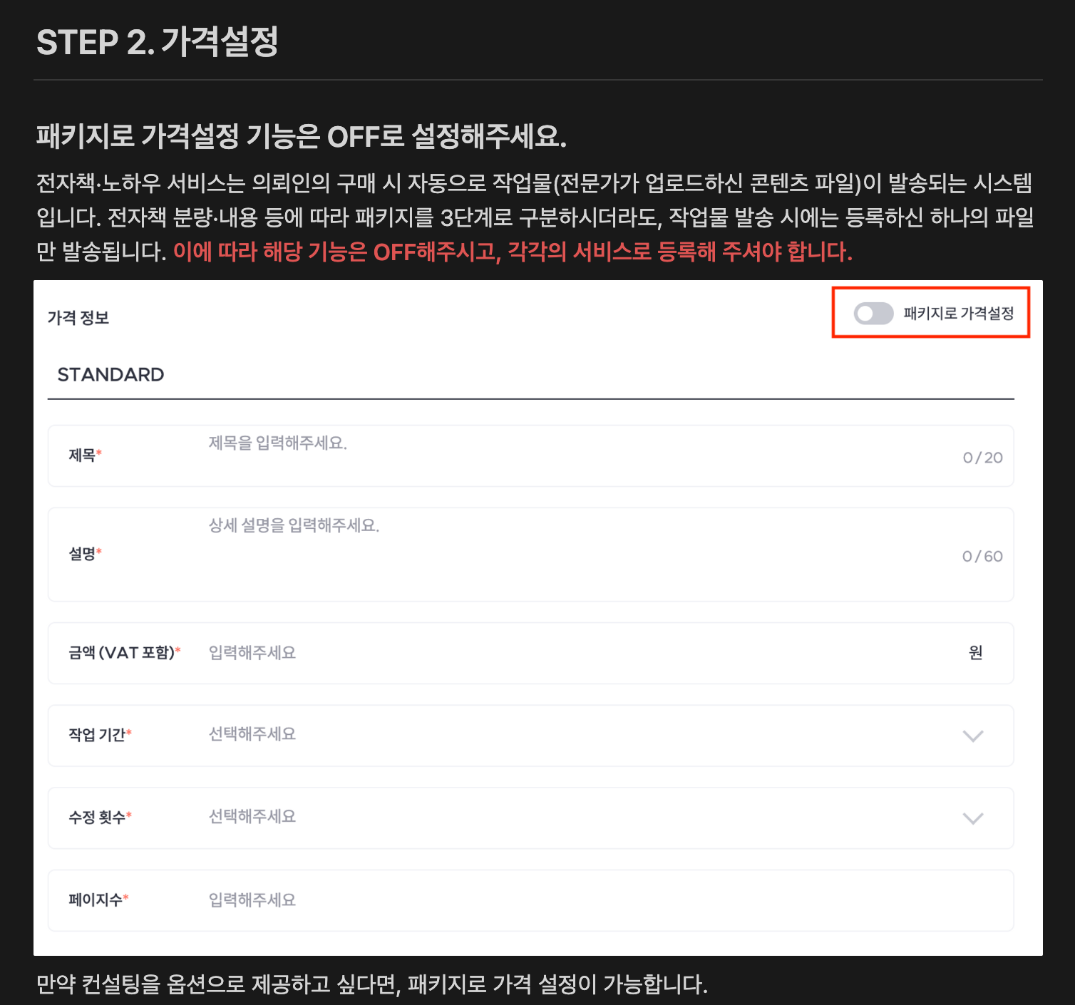 전자책 가격 설정하실때, 우상단의 패키지로 가격 설정은 OFF로 해주세요. 만약 컨설팅이나 기타 다른 서비스와 함께 판매하신다면 패키지로 설정하셔도 됩니다. 스탠더드, 딜럭스, 프리미엄으로 패키지를 구분하시더라도, 고객이 구매하면 동일한 1개의 파일이 전송되니 주의하세요. 👉 이 부분은 꼭 확인하셔야겠네요. 모르고 있었다가는 CS로 다소 골치 아플 수도 있었겠어요.
