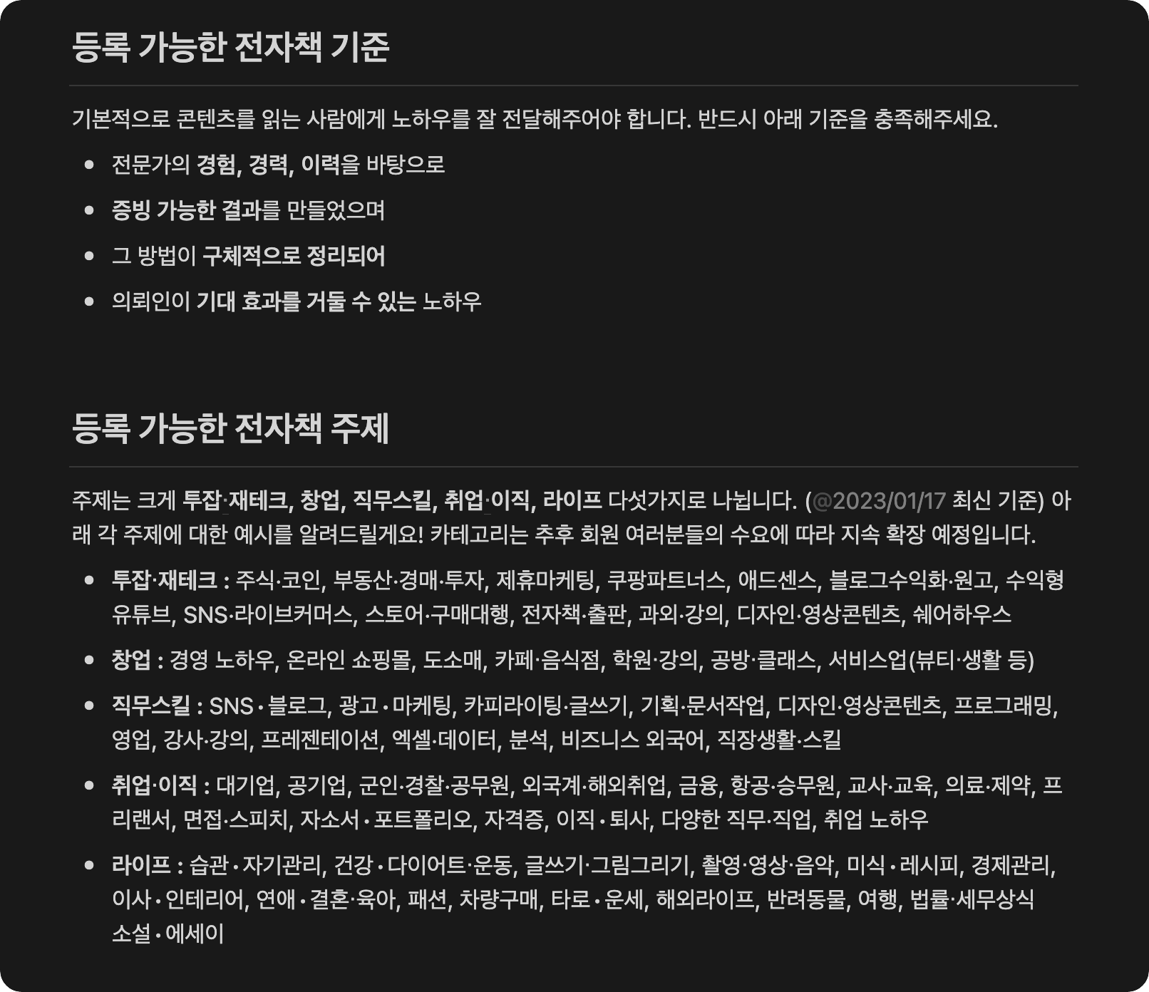 전자책 어떻게 써야 할지 모르겠다면? 크몽 '등록 기준'을 유심히 살펴보세요. 크몽이 선호하는 전자책의 핵심은 "전문가의 경험,경력,이력을 바탕으로, 증빙 가능한 결과를 만들었으며, 그 방법이 구체적으로 정리되어, 의뢰인이 기대효과를 거둘 수 있는 노하우"인데요. 이 내용은 사실 좋은 지식 콘텐츠의 핵심이라고 봐도 무방해요. 자신의 지식과 경험 중에서 저 네 가지를 잘 충족할 수 있는 포인트가 있는지 꼭 살펴보세요.